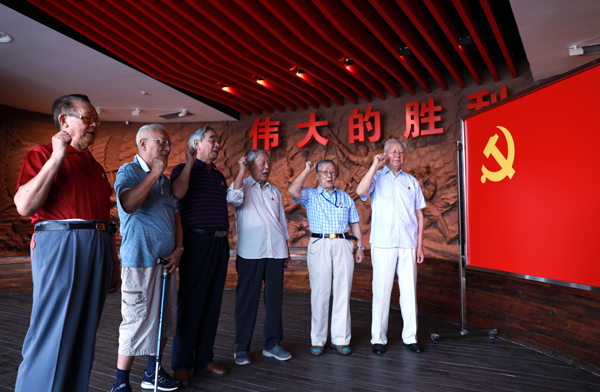 7月4日,南鋼黨委離休老干部黨支部6名老同志,前往南京渡江勝利紀念館開展“不忘初心、牢記使命”主題教育,追憶戰爭年代艱苦卓絕的革命生涯。據了解,這些老人平均年齡90.1歲,最長黨齡78年,曾參加過抗日戰爭、淮海戰役、渡江戰役、上海戰役、抗美援朝等。圖為老人們在南京渡江勝利紀念館里重溫入黨誓詞。 (特約通訊員 吳斌 攝)