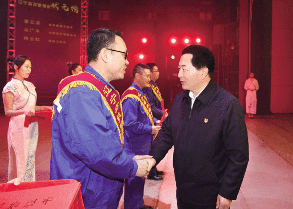 本鋼集團黨委書記、董事長陳繼壯為榮獲遼寧省職工技能大賽的3名狀元頒獎。