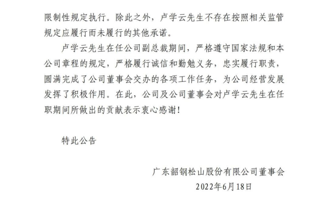 2022年6月17日,廣東韶鋼松山股份有限公司董事會(huì)收到副總裁盧學(xué)云的書面辭呈。因工作原因,盧學(xué)云申請(qǐng)辭去副總裁職務(wù)。根據(jù)《公司法》《公司章程》等有關(guān)規(guī)定,盧學(xué)云辭去副總裁職務(wù)的辭呈自送達(dá)董事會(huì)之日起生效。
