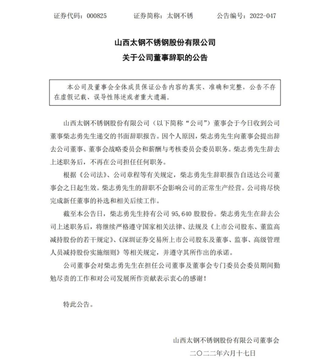 同一天,山西太鋼不銹鋼股份有限公司董事收到公司(以下簡(jiǎn)稱公司)董事柴志勇遞交的書面辭職報(bào)告。因個(gè)人原因,柴志勇向董事會(huì)提出辭去公司董事、董事會(huì)戰(zhàn)略委員會(huì)和薪酬與考核委員會(huì)委員職務(wù)。柴志勇辭去上述職務(wù)后,不再在公司擔(dān)任任何職務(wù)。根據(jù)《公司法》、公司章程等有關(guān)規(guī)定,柴志勇辭職報(bào)告自送達(dá)公司董事會(huì)之日起生效。