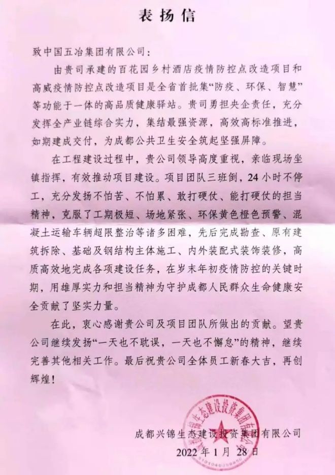 敢打必勝,使命必達。為以快制快,跑贏病毒,中國五冶集團組建44支黨員抗疫突擊隊,設立374個黨員抗疫先鋒崗,扎根一線不斷刷新“五冶速度”。過程中,五冶人與時間賽跑,以13個小時的“極限挑戰”交付了日均10萬份新冠病毒核酸檢測能力的樣本分析實驗室,鏖戰7個晝夜率先完成了可容納萬人的上海臨港方艙建設任務,歷時4個月呈現了總建筑面積17萬平(含五星級高端酒店4萬平、四星級精品酒店5萬平、高端公寓及配套設施8萬平)的國際一流健康驛站——成都天府國際健康服務中心,憑借一張張亮眼成績單,獲得社會各方廣泛贊譽和主流媒體高頻關注,進一步彰顯了中國五冶集團敢挑大梁、勇擔大任的工程建設主力軍風采!