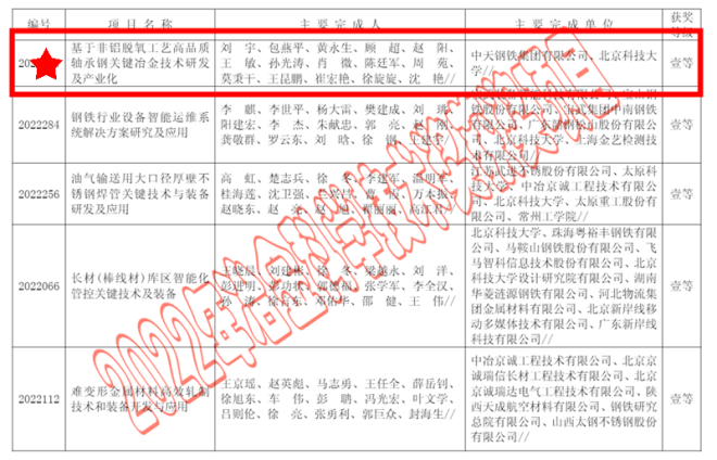 “基于非鋁脫氧工藝高品質軸承鋼關鍵冶金技術研發及產業化”項目獲得一等獎