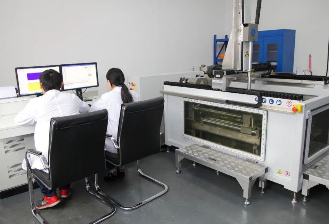 技術人員在用美國GE水浸探傷儀對圓鋼宏觀夾雜物進行檢測