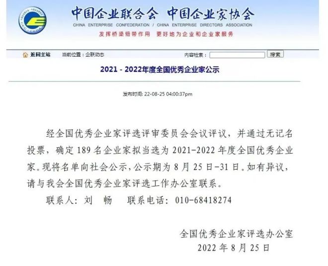 近日,中國企業家聯合會、中國企業家協會網站發布《2021—2022年度全國優秀企業家公示》。經全國優秀企業家評選評審委員會會議評議,并通過無記名投票,全國優秀企業家評選辦公室確定189名企業家擬當選為2021-2022年度全國優秀企業家。其中,包頭鋼鐵(集團)有限公司黨委書記、董事長魏栓師上榜。