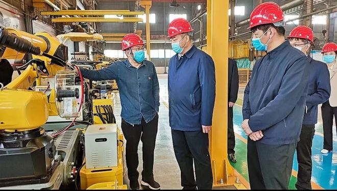 威猛股份總經(jīng)理王思民(左1)陪同新鄉(xiāng)市領(lǐng)導(dǎo)視察公司研發(fā)的焊接機(jī)器人“小萌”