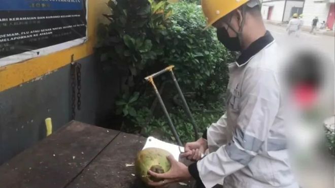 圖|印尼小伙勞比在為中國(guó)師傅加工椰子