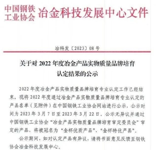據悉,冶金產品實物質量品牌培育活動由中國鋼鐵工業協會領導和指導,組成審定委員會審定冠名,每年組織一次,對達到國際同類產品實物質量水平的優質產品授予“金杯優質產品”“金杯特優產品”稱號,被譽為行業內的“奧斯卡”。