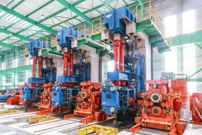 生產(chǎn)線設有燃高爐煤氣步進梁式加熱爐一座,共有58架軋機,分為6架粗軋機組(共用)、10架中軋機組(分A/B線)、4架預精軋機組(分A/B線)、2套精軋機組(分A/B線)。粗、中軋機組及預精軋前2架軋機采用平、立交替布置短應力線軋機。預精軋機組后4架軋機,采用懸臂軋機,均為平、立交替布置,每架軋機均由交流電機單獨傳動。