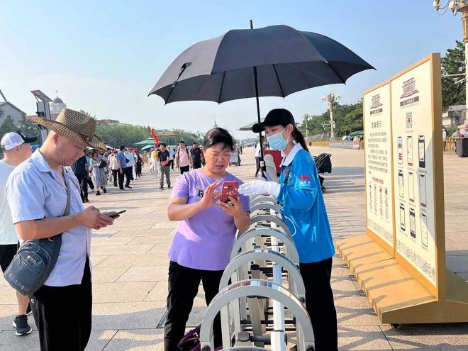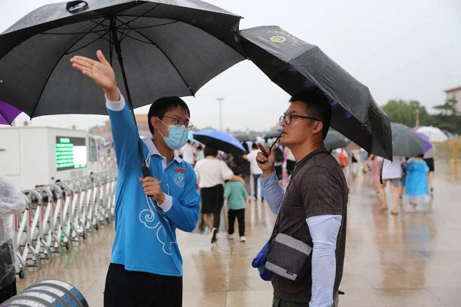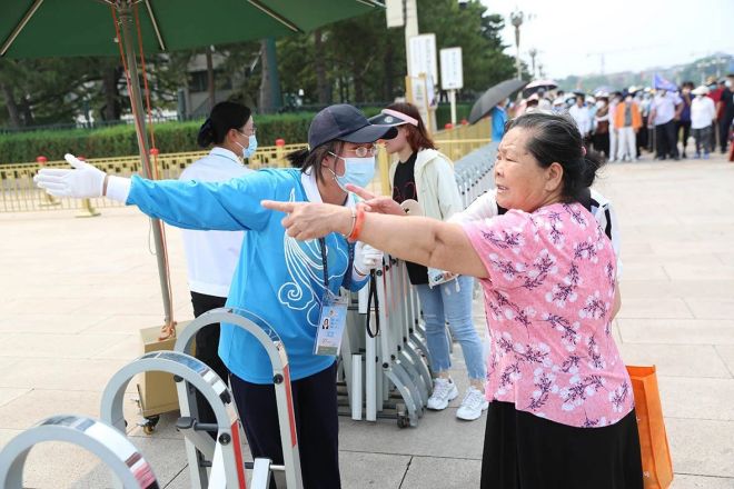 端午假期的北京持續高溫,中午天安門廣場地區的溫度達到了41度以上,體感溫度更是達到47度以上,6月23日11點58分,在紀念堂東門外有一名瞻仰群眾出現中暑癥狀,癱倒在地。首鋼在崗志愿者王寧和李涵宇第一時間對其進行了救助,李涵宇迅速把中暑者攙扶到武警的遮陽傘下,王寧立即給中暑者貼了冰涼貼,并用礦泉水不斷地擦拭中暑者頭部和脖頸,用清涼油擦拭中暑者太陽穴。過程中還不斷安慰中暑者,慢慢地中暑者恢復了意識,志愿者們把中暑者交給管轄警察后才放心離開。6月25日,志愿者程昊剛剛上崗,看到一位坐著輪椅的90歲老人,想進入紀念堂瞻仰毛主席,見老人行動不方便,程昊就和北助殘崗的志愿者一起把老人的輪椅拉上了紀念堂高臺,為了輪椅不打滑,程昊還主動摘掉了手套。做這樣的小事,就是志愿者每天的日常。
