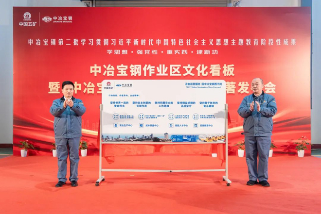 中冶寶鋼黨委以深入開展學習貫徹習近平新時代中國特色社會主義思想主題教育為契機,堅持以人民為中心的發展思想,以提高基層管理能力、增強作業區核心功能為目標,探索實施作業區文化建設,形成了具有中冶寶鋼特色的作業區文化看板和展現中冶寶鋼人忠誠敬業擔當的《中冶寶鋼產業工人之歌》專著,取得了深入開展主題教育的階段性成果。發布會上,公司黨委號召各級黨組織和全體員工,認真貫徹中國五礦“五大核心要義”,充分發揮作業區安全生產中心、成本質量中心、技能人才中心、思想教育中心的重要作用,加速領跑冶金運營服務高質量發展,努力把中冶寶鋼打造成為鋼鐵企業最廣泛最緊密最深厚的戰略力量。