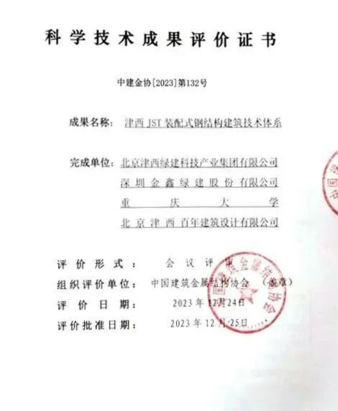 2023年12月24日,中國建筑金屬結構協會在唐山組織召開了“津西JST裝配式鋼結構建筑技術體系”科技成果評價會。
