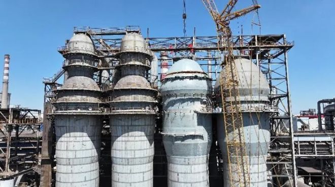 安鋼4747m3高爐配置4座小帽子頂燃式熱風爐,由于熱風爐風溫低、煤氣消耗高、爐殼頻繁開裂,存在低效及安全隱患,2023年安鋼集團確定在線陸續實施切割爐殼改造為自主擁有的豫興懸鏈線頂燃式熱風爐技術,改造總工期400天。