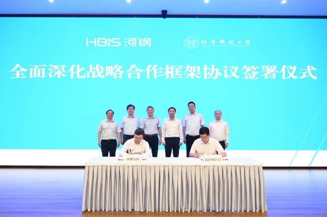 河鋼集團總監,河鋼材料院、河鋼數字負責人,河鋼集團科技創新部、戰略研究院有關人員,北科大人事處、研究生院、科技成果轉化研究院、冶金與生態工程學院、計算機與通信工程學院、經濟管理學院、管莊校區和綠色低碳鋼鐵冶金全國重點實驗室、鋼鐵共性技術協同創新中心負責人,以及招生就業處、材料科學與工程學院、工程技術研究院有關負責人參加簽約儀式。