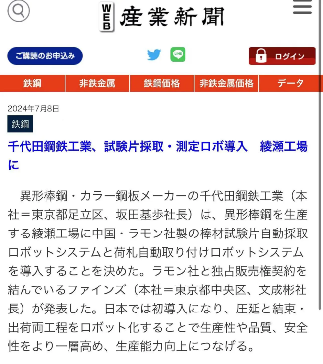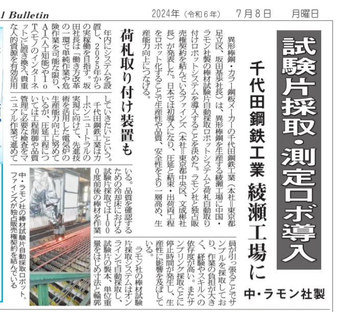 2024年7月8日,據(jù)日本《鋼鐵新聞》和《產(chǎn)業(yè)新聞》等權威媒體報道:為積極推動智能化新技術、新裝備,提高自動化水平,節(jié)省人力,提高安全性和生產(chǎn)率,日本知名鋼企——千代田鋼鐵工業(yè)株式會社,在其螺紋鋼生產(chǎn)基地綾瀨工廠(東京都足立區(qū))引入鐳目公司創(chuàng)新研發(fā)的機械手棒材取樣系統(tǒng)和機械手焊標系統(tǒng)。這是日本鋼企首次引入兩種中國企業(yè)研發(fā)的智能化創(chuàng)新系統(tǒng)。