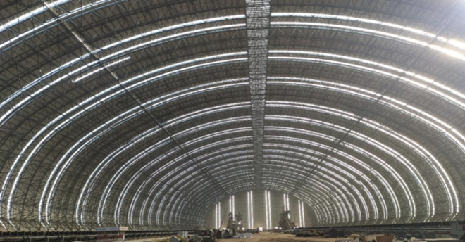 亮點一:多支線和直供系統(tǒng)的高效儲運新工藝與物流網協(xié)同,形成類型齊全、功能完備的綜合原料場。其中B型料場是目前國內跨度最大的螺栓球網架結構的全封閉料場。