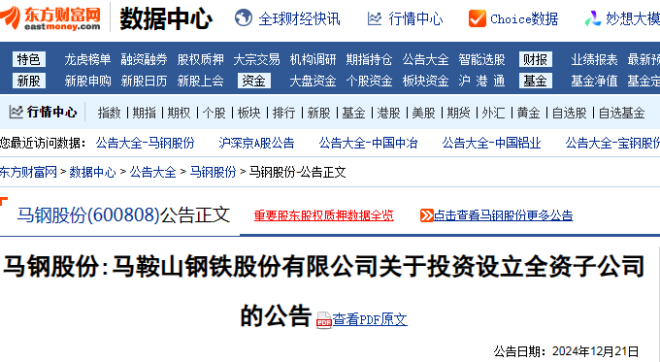 12月21日,馬鋼股份發(fā)布了《馬鞍山鋼鐵股份有限公司關(guān)于投資設(shè)立全資子公司的公告》(以下簡稱“公告”)。