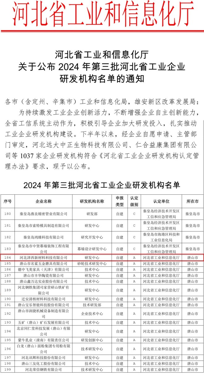 近日,河北省工業和信息化廳發布《關于公布2024年第三批河北省工業企業研發機構名單的通知》,津西新材料通過河北省工業企業研發機構A級認定,這標志著津西新材料在裝配式建筑、綠色鋼結構、固廢綜合利用等領域技術研發能力得到高度認可。