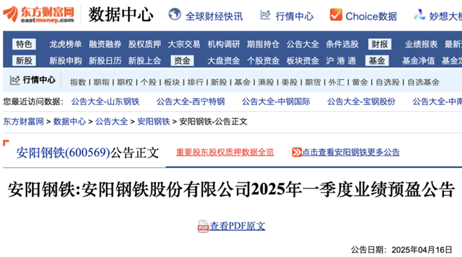 4月16日,安陽鋼鐵發布《安陽鋼鐵股份有限公司2025年一季度業績預盈公告》。