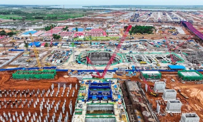 5月28日,記者在港區的制高點,也是北部區塊港口工程的關鍵性項目——已封頂的翻車機房房頂上看到,整個港區一派繁忙景象,吊機林立、施工車輛川流不息,但夜間下雨讓道路顯得有些泥濘。西芒杜港口控股公司、西芒杜港口項目公司物資設備部部長陳強告訴記者:“進入雨季后,我們這里會一天到晚不停地下雨,室外作業基本都停了,只能進行室內作業。因此,各參建單位都加派人手,爭取在雨季來臨前,完成必要的室外工程施工。目前,360平方米的港區內,集聚了共7000人左右的中外施工人員。很多項目需要協同推進,通過現場精密安排和協調指揮,12項工程正同步進行作業。”
