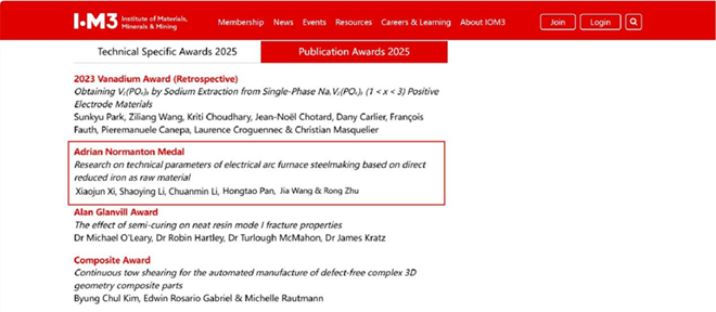近日,中冶京誠(chéng)工程技術(shù)有限公司(以下簡(jiǎn)稱“中冶京誠(chéng)”)氫冶金和電爐技術(shù)團(tuán)隊(duì)在2024年發(fā)表于冶金權(quán)威期刊“Ironmaking and Steelmaking”上的論文“Research on technical parameters of electrical arc furnace steelmaking based on direct reduced iron as raw material”榮獲英國(guó)材料、礦物和礦業(yè)學(xué)會(huì)(IOM3)2025年度最佳論文獎(jiǎng),并受邀赴英國(guó)參加Adrian Normanton Medal金質(zhì)獎(jiǎng)?wù)骂C獎(jiǎng)典禮。此次獲獎(jiǎng)不僅是中國(guó)學(xué)者自2018年后再度摘得桂冠,更是中國(guó)冶金企業(yè)實(shí)現(xiàn)在此獎(jiǎng)項(xiàng)上零的突破。
