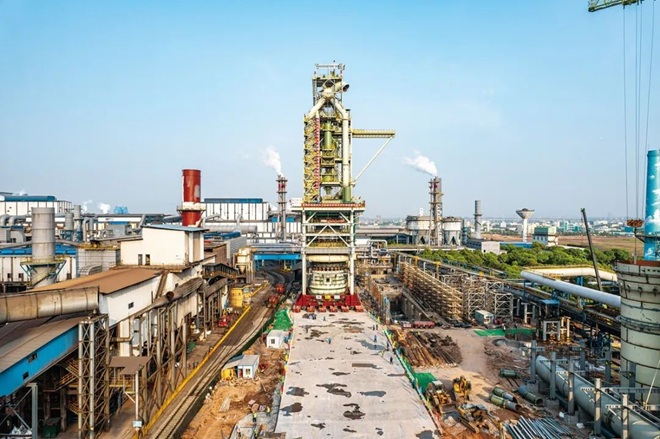 2025年,由上海寶冶承建的衢州元立1280立方米高爐項目,推出“高爐本體及框架一體化整體滾裝”技術,標志冶金工程模塊化進入全系統集成新階段。該項目需拆除2座舊高爐,新建1座配套完整的1280立方米高爐。上海寶冶團隊在工廠搭建大型預制平臺,完成該高爐本體、框架、冷卻系統、管道、電氣設備、爐頂設施等全系統集成預組裝,形成高85.7米、重3900噸的一體化模塊。該高爐運輸與安裝采用12軸智能化SPMT模塊車(承載超4000噸)。運輸前,該項目團隊勘察改造路線、加固路面,制訂詳細方案;運輸中,通過計算機系統實時調控車速、轉向與姿態,確保平穩;現場安裝時,模塊車將高爐緩慢降至預設基礎定位裝置,全程高精度監測調整,并創造了國內外高爐運輸與安裝高度、重量及效率的紀錄。
