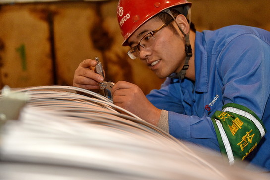 太鋼集團質檢人員在檢驗“筆尖鋼”鋼絲的質量情況
