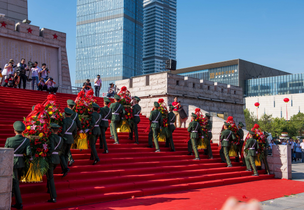上午8:30,莊嚴的秋收起義紀念碑前,各界人士全體合唱《國歌》,向為中國人民解放事業和共和國建設事業英勇獻身的烈士們默哀,敬獻花籃,并瞻仰秋收起義紀念碑。