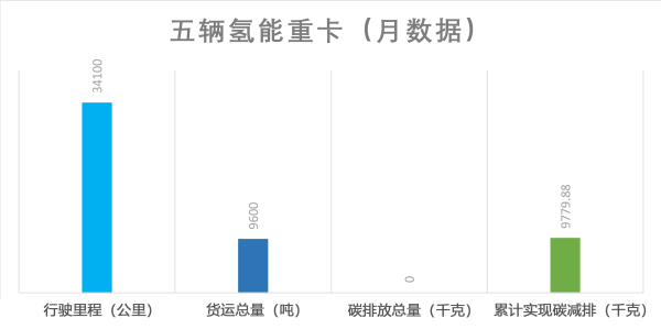 截至9月20日,5輛氫能重卡行駛里程達34100余公里;貨運總量9600余噸;碳排放總量為0,累計實現碳減排約9800千克……