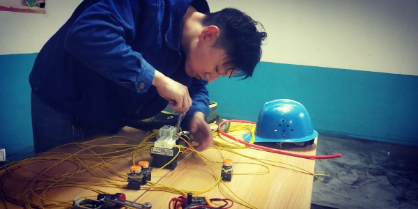 按照題目要求,先畫出主回路電氣原理圖、控制回路電氣原理圖、分析工作原理、選擇電氣元件及主回路電纜的型號和容量(帶運行指示燈),再根據現場提供的電氣元件進行接線并進行通電試驗,限時90分鐘。參加本次實踐考試的有36人,分四場進行,今天是第一場,八個人。這邊奮筆疾書,畫電路設計圖、分析原理。那邊按照圖紙已經開始接線,手指捏緊電線頭,用線鉗麻利的分線,用螺絲刀緊線,接好一個啟動開關,看一下圖紙,再接下一組元器件……他們細心認真的樣子與平時大大咧咧的樣子判若兩人。看他,轉爐電工劉軒,凝神聚力,目光專注在自己的考題上,認真完成他的考試作品。