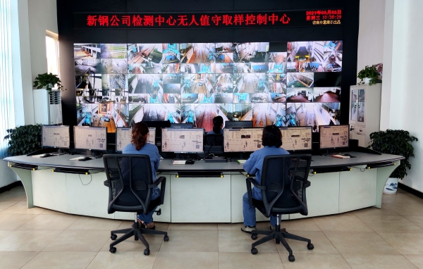 圖為檢測中心無人值守取樣控制中心的職工在監控畫面時情景