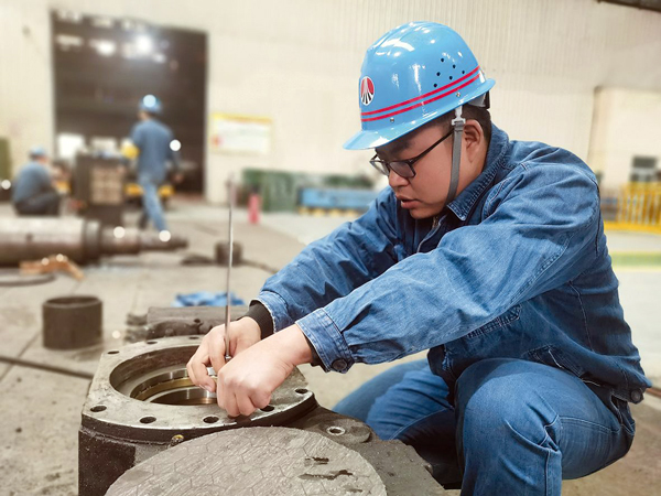 他時而讓運轉中的堆焊機暫停下來,彎腰認真檢查產品加工質量;時而走到堆焊機的后面,查看焊絲的剩余量,以確保焊絲量充足;時而進行加工尺寸復測,并做好標識……一波操作下來,譚孟良的汗水浸濕了衣衫,臉頰上也流下了汗滴。為避免中斷堆焊引發工藝缺陷,他堅守在酷熱難耐的廠房,在高溫環境中工作了5個小時,直至出色地完成任務。