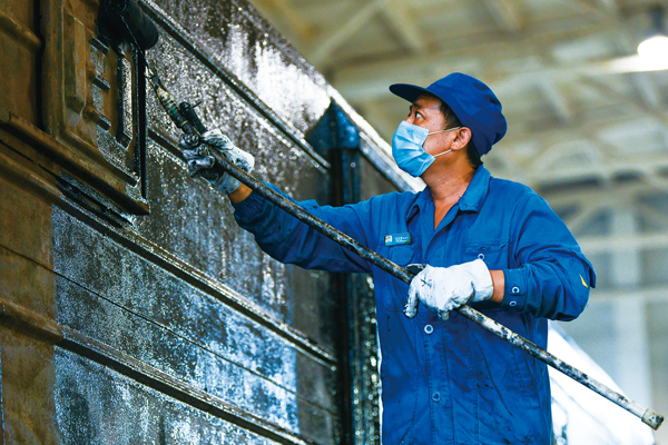 圖為該公司職工正在粉刷檢修后的機(jī)車。