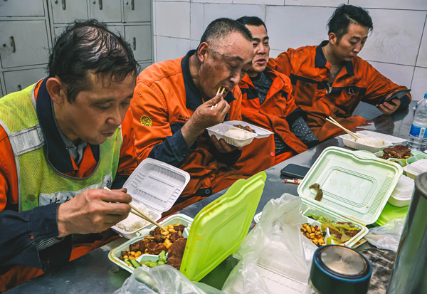 圖為當日下午1點多,剛剛更換完高爐風口小套的幾位職工正在吃午飯。