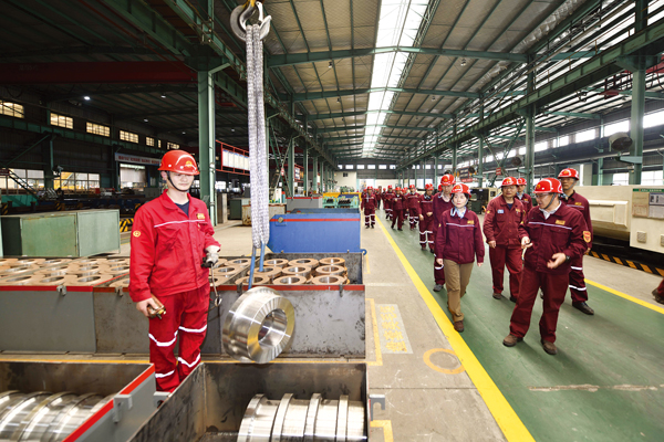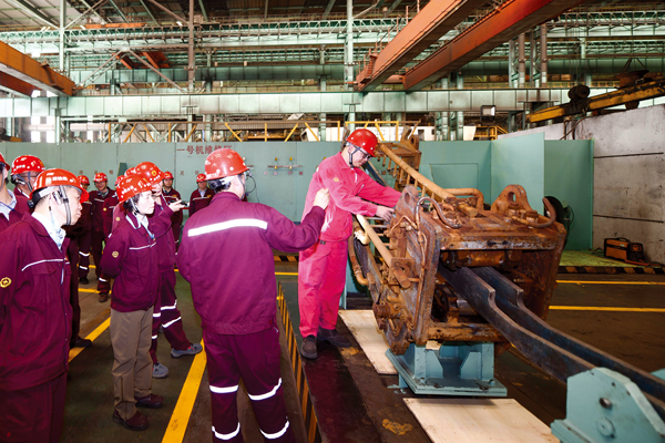 在沙鋼金工車間,員工用“小發明”讓設備維修效率翻倍,更讓維修成本“瘦身”。圖為觀摩團成員路過時,一線員工正用自制器具安裝軸承座。