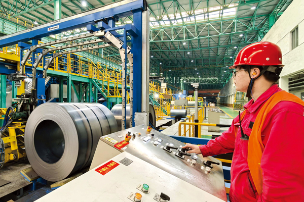 圖為沙鋼超薄帶二車間4號精整線用“智能”重新定義“安全”——防燙報警、遠程取樣、自動防護,每一處細節都在詮釋“本質安全”。圖為該產線員工正操作設備生產。