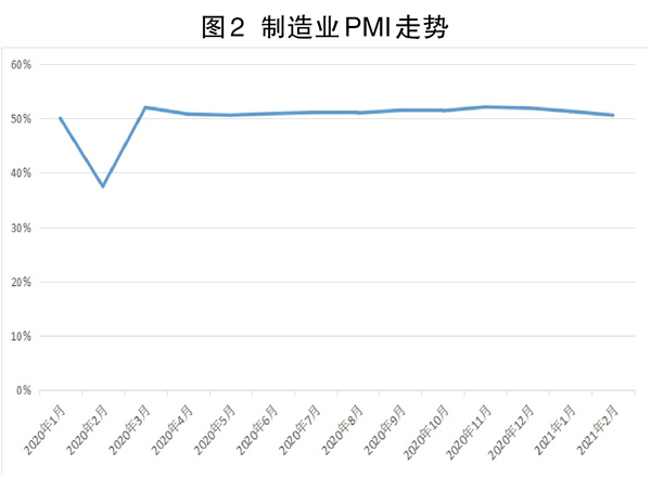 最新公布數(shù)據(jù)顯示,2月份中國制造業(yè)PMI(采購經(jīng)理指數(shù))達50.6%,低于1月份0.7個百分點,連續(xù)12個月位于臨界點(50%)以上(見圖2)。筆者預計,2021年我國制造業(yè)PMI將持續(xù)位于榮枯線以上,預計2021年消費和制造業(yè)投資同比均增長10%左右。