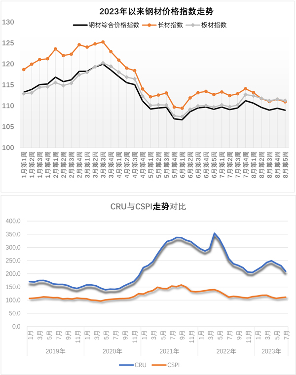 當周,中國鋼材價格指數(shù)(CSPI)為108.97點,周環(huán)比下降0.45點,跌幅為0.41%;比7月末下降2.25點,降幅為2.02%;比去年底下降4.28點,降幅為3.78%;同比下降3.63點,降幅為3.22%。其中,長材價格指數(shù)為110.95點,周環(huán)比下降0.60點,降幅為0.54%;比7月末下降3.13點,降幅為2.74%;同比下降7.07點,降幅為5.99%。板材價格指數(shù)為111.27點,周環(huán)比下降0.31點,降幅為0.28%;比7月末下降1.41點,降幅為1.25%;同比下降0.70點,降幅為0.63%。