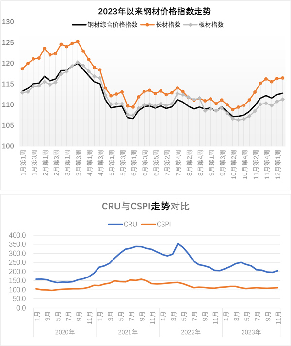 12月11日—12月15日當(dāng)周,國(guó)內(nèi)鋼材價(jià)格指數(shù)小幅上漲,長(zhǎng)材價(jià)格指數(shù)有所上漲,板材價(jià)格指數(shù)小幅上漲。