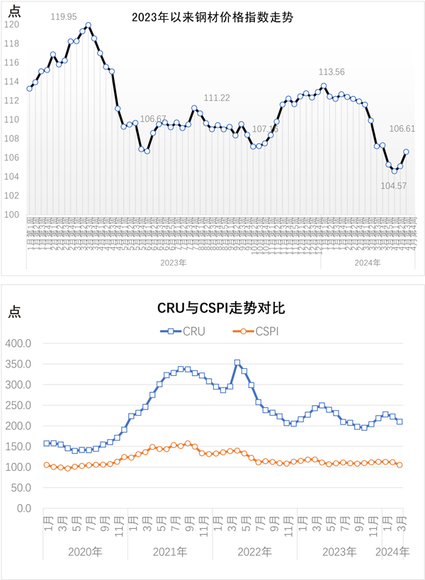 當(dāng)周,中國(guó)鋼材價(jià)格指數(shù)(CSPI)為106.61點(diǎn),周環(huán)比增加1.51點(diǎn),增幅為1.44%;比上月末上漲1.34點(diǎn),漲幅為1.27%;比去年底下降6.29點(diǎn),降幅為5.57%;同比下降8.46點(diǎn),降幅為7.35%。其中,長(zhǎng)材價(jià)格指數(shù)為109.11點(diǎn),周環(huán)比增加2.62點(diǎn),增幅為2.46%;比上月末上漲3.07點(diǎn),漲幅為2.90%;比去年底下降7.00點(diǎn),降幅為6.03%;同比下降9.31點(diǎn),降幅為7.86%。板材價(jià)格指數(shù)為104.88點(diǎn),周環(huán)比增加0.91點(diǎn),增幅為0.88%;比上月末上漲0.37點(diǎn),漲幅為0.35%;比去年底下降6.92點(diǎn),降幅為6.19%;同比下降11.57點(diǎn),降幅為9.94%。