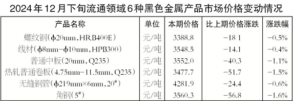 2024年12月下旬,φ20毫米HRB400E螺紋鋼本期價格為3388.8元/噸,環(huán)比下降18.1元/噸,降幅為0.5%;φ8毫米—φ10毫米HPB300線材本期價格為3548.5元/噸,環(huán)比下降14.1元/噸,降幅為0.4%;20毫米Q235普通中板本期價格為3552.0元/噸,環(huán)比下降40.3元/噸,降幅為1.1%;4.75毫米—11.5毫米Q235熱軋普通卷板本期價格為3477.7元/噸,環(huán)比下降51.7元/噸,降幅為1.5%;φ219毫米×φ6毫米20#無縫鋼管本期價格為4281.9元/噸,環(huán)比下降24.4元/噸,降幅為0.6%;5#角鋼本期價格為3560.3元/噸,環(huán)比下降56.8元/噸,降幅為1.6%。 (郭同炬)