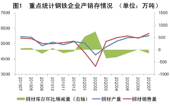 1月~7月份,重點統(tǒng)計鋼鐵企業(yè)同2019年1月~7月份相比,國內(nèi)鋼材銷售量的增幅大于鋼材產(chǎn)量的增幅,表明重點統(tǒng)計鋼鐵企業(yè)增產(chǎn)的鋼材在國內(nèi)市場得到了消化,同時國內(nèi)市場還消化了一部分出口轉(zhuǎn)內(nèi)銷的鋼材和一部分鋼材庫存。