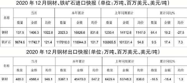 根據(jù)海關統(tǒng)計快訊數(shù)據(jù),2020年12月份,我國進口鋼材137.5萬噸,環(huán)比減少47.9萬噸,下降25.8%;均價為1022.8 美元/噸,環(huán)比增加 152.3美元/噸,增長17.5%。2020年1月~12月份,累計進口鋼材2023.3萬噸,同比增加792.9萬噸,增長64.4%。