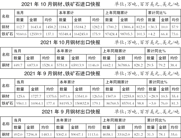 10月份,我國(guó)出口鋼材449.7萬(wàn)噸,環(huán)比減少42.3萬(wàn)噸,下降8.6%;均價(jià)為1528.4美元/噸,環(huán)比增加45.3美元/噸,增長(zhǎng) 3.1%。1月~10月份,我國(guó)累計(jì)出口鋼材5751.8 萬(wàn)噸,同比增加1309.7萬(wàn)噸,增長(zhǎng)29.5%。