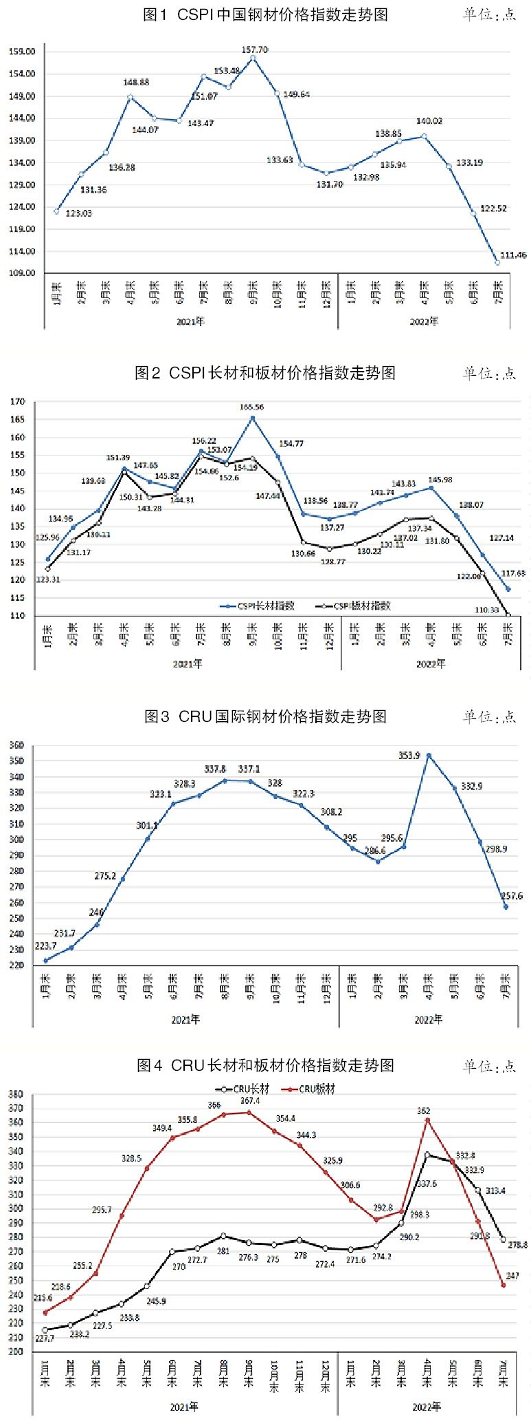 7月份,CRU國際鋼材價格指數為257.6點,環比下降41.3點,降幅為13.8%,較6月份降幅加大3.6個百分點;同比下降70.7點,降幅為21.5%。(見圖3)