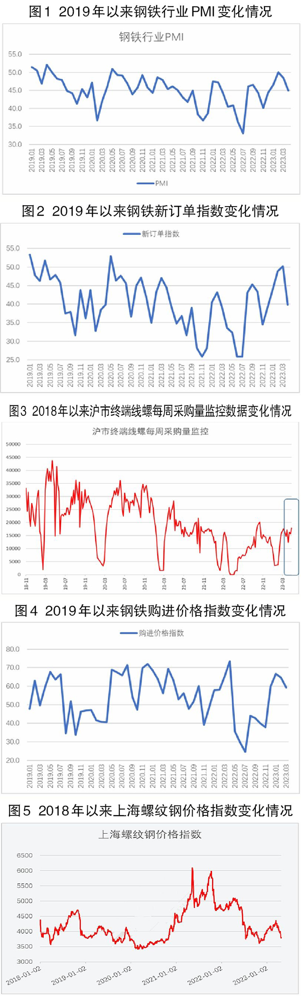 從中物聯鋼鐵物流專業委員會調查、發布的鋼鐵行業PMI(采購經理人指數)來看,2023年4月份為45%,環比下降3.4個百分點,連續2個月環比下降,顯示鋼鐵行業運行有所放緩。分項指數變化顯示,市場需求有所收緊,鋼廠生產有所回落,原材料價格下降明顯,鋼材價格震蕩下行,整體來看鋼鐵行業旺季不旺。預計5月份,鋼材市場供需兩端或繼續小幅下降。鐵礦石價格繼續回落,鋼材價格震蕩走低。