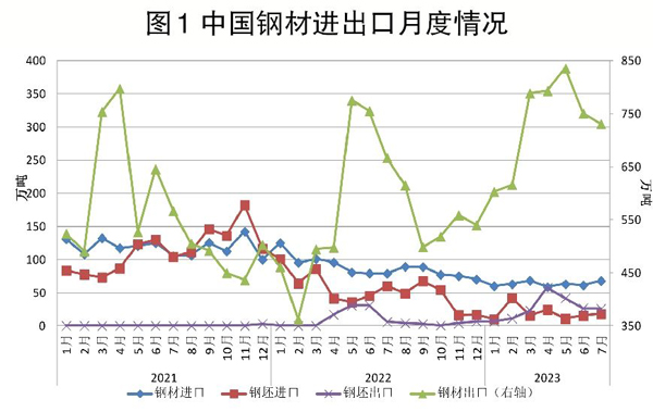 1月—7月份,我國進口鋼材441.9萬噸,同比減少32.6%;進口平均單價為1699.8美元/噸,同比上漲7.7%;進口鋼坯135.7萬噸,同比下降68.7%。我國出口鋼材5089.2萬噸,同比增長27.9%;出口平均單價為1045.2美元/噸,同比下跌28.1%;出口鋼坯193.3萬噸,同比增加108.6萬噸;粗鋼凈出口4906.8萬噸,同比增長1790.1萬噸,增幅57.4%。