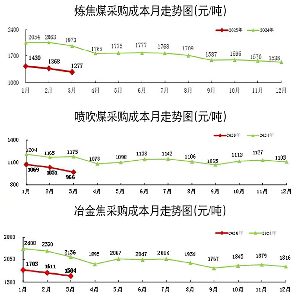 3月份,煉焦煤加權平均折算成干基的采購成本為1276.70元/噸,環比減少91.18元/噸,下降6.67%;第1季度累計平均折算成干基的采購成本為1358.28元/噸,同比減少678.76元/噸,下降33.32%。
