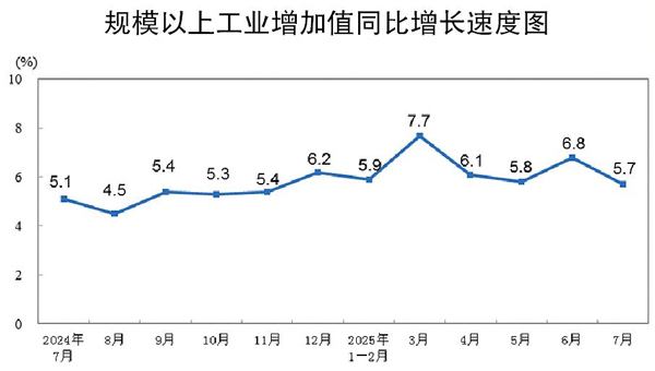 本報訊 7月份,規(guī)模以上工業(yè)增加值同比實際增長5.7%(增加值增速均為扣除價格因素的實際增長率),環(huán)比增長0.38%。1月—7月份,規(guī)模以上工業(yè)增加值同比增長6.3%。