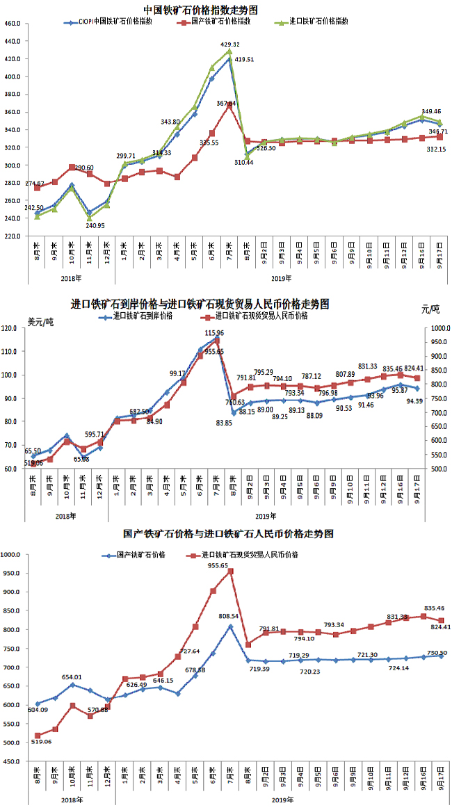 9月17日,中國鐵礦石價格指數(shù)(CIOPI)346.71點,環(huán)比下降4.40點,降幅為1.25%。其中:國產(chǎn)鐵礦石價格指數(shù)為332.15點,環(huán)比上升1.33點,升幅為0.40%;進口鐵礦石價格指數(shù)為349.46點,環(huán)比下降5.48點,降幅為1.54%。
