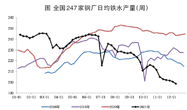 需求方面,鐵礦石需求持續低位,粗鋼壓減政策的執行疊加“2+26”城的采暖季限產要求使得粗鋼產量同比下降30%,再加上冬奧會、終端需求承壓等因素,預期鐵礦石需求中短期均將維持偏弱趨勢。據相關數據,12月10日,247家鋼廠高爐開工率為68.14%,周環比下降1.66%,同比去年下降16.63%;高爐煉鐵產能利用率為74.12%,周環比下降0.67%,同比下降17.35%;鋼廠盈利率為79.65%,周環比增加12.12%,同比下降12.12%;日均鐵水產量為198.70萬噸,周環比下降1.81萬噸,同比下降44.77萬噸。